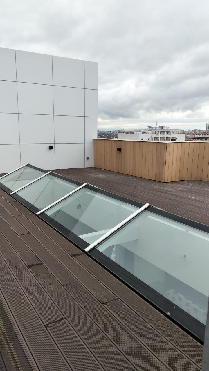 Краснодар, эксплуатируемая кровля, частное домовладение, декинг вельвет классик коричневый, сайдинг винтаж натуральный